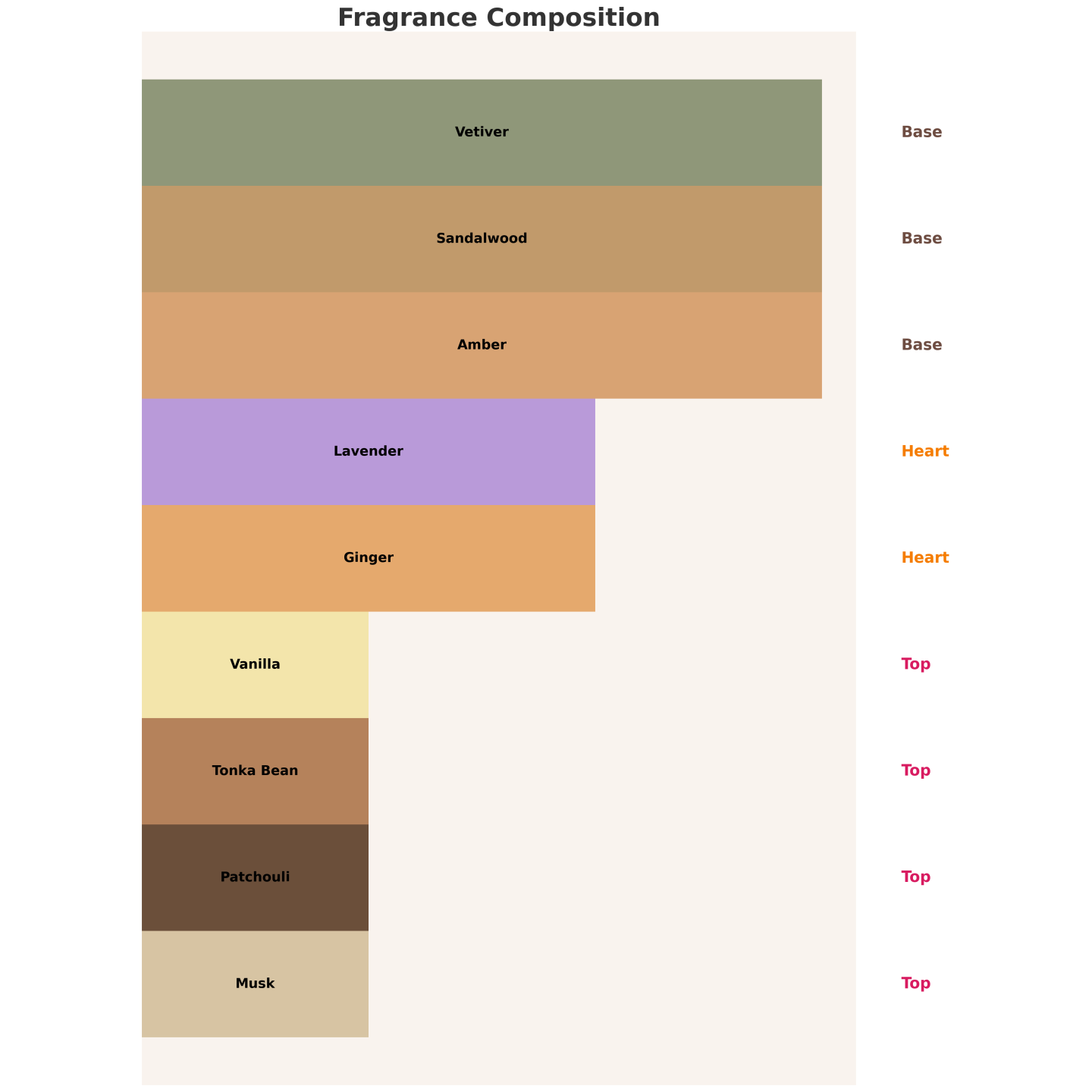 To ciepła, orientalno–drzewna kompozycja z wyraźnymi nutami przypraw, paczuli, wanilii i drewna sandałowego, z dodatkiem bursztynowej głębi.