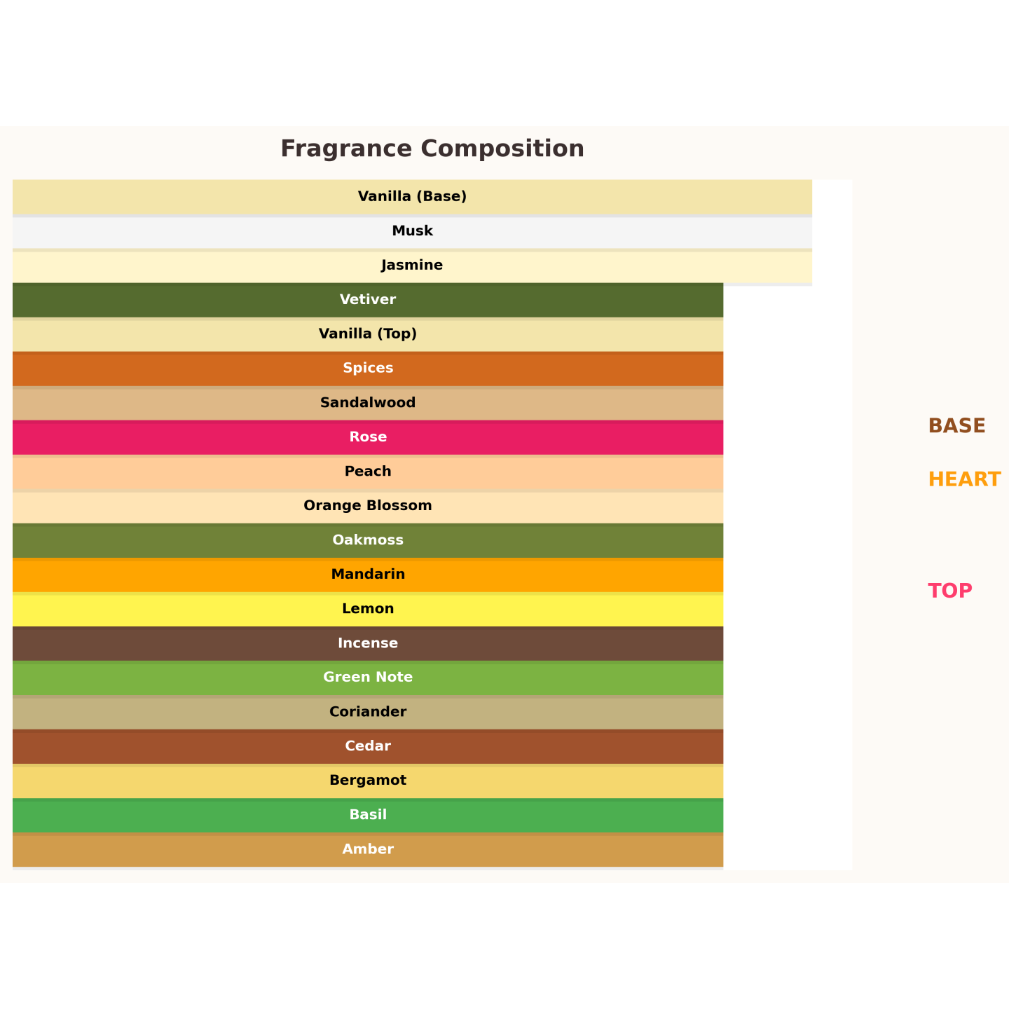 ✔ Serce: jaśmin, drzewo sandałowe, cedr, kolendra, przyprawy, róża, mech dębowy, kwiat pomarańczy