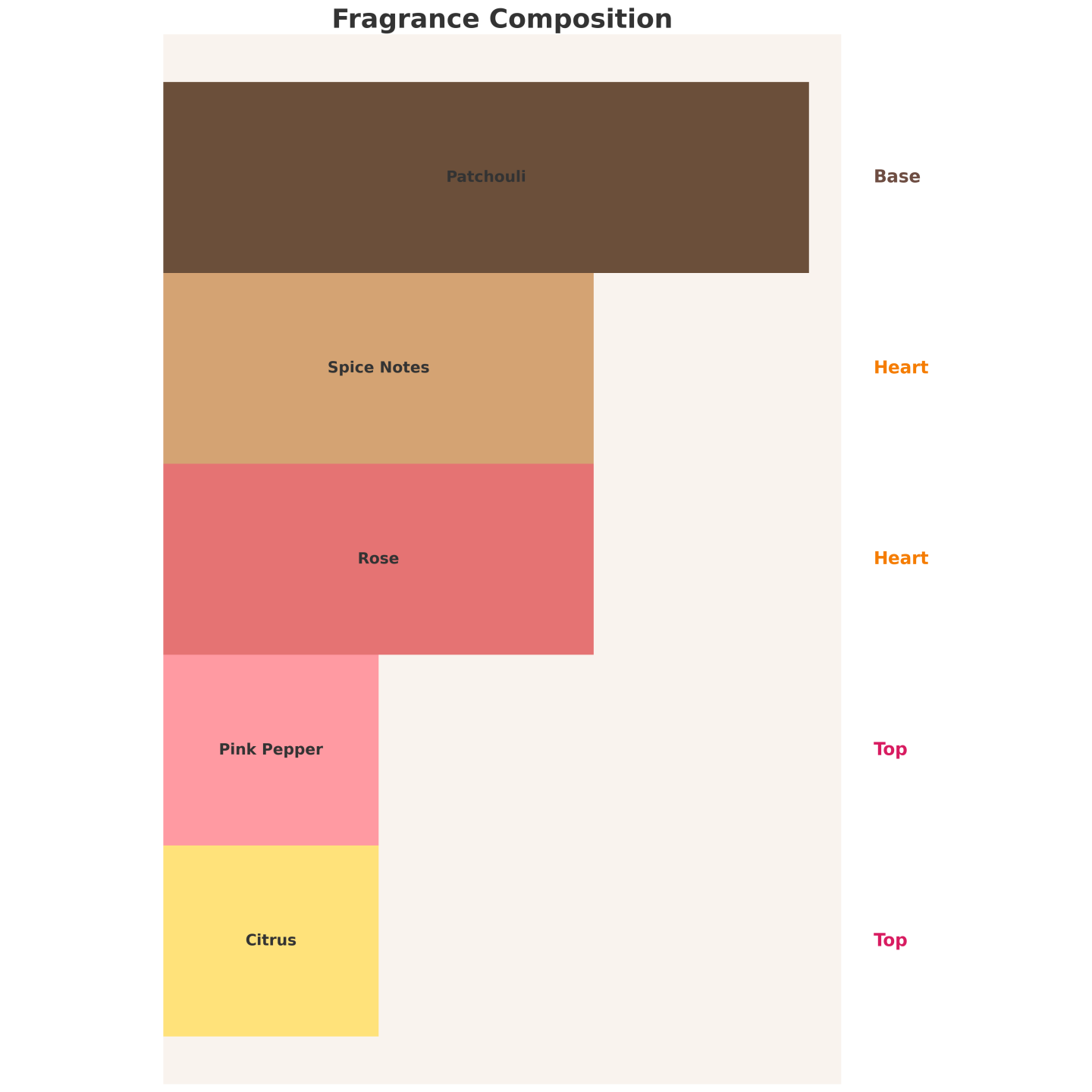 Es ist ein zitrusartiger, frischer Duft mit einer leicht würzigen Note von rosa Pfeffer und einem eleganten, blumigen Herzen aus Rose. Eine Patschuli-Basis verleiht ihm Klasse und Haltbarkeit.