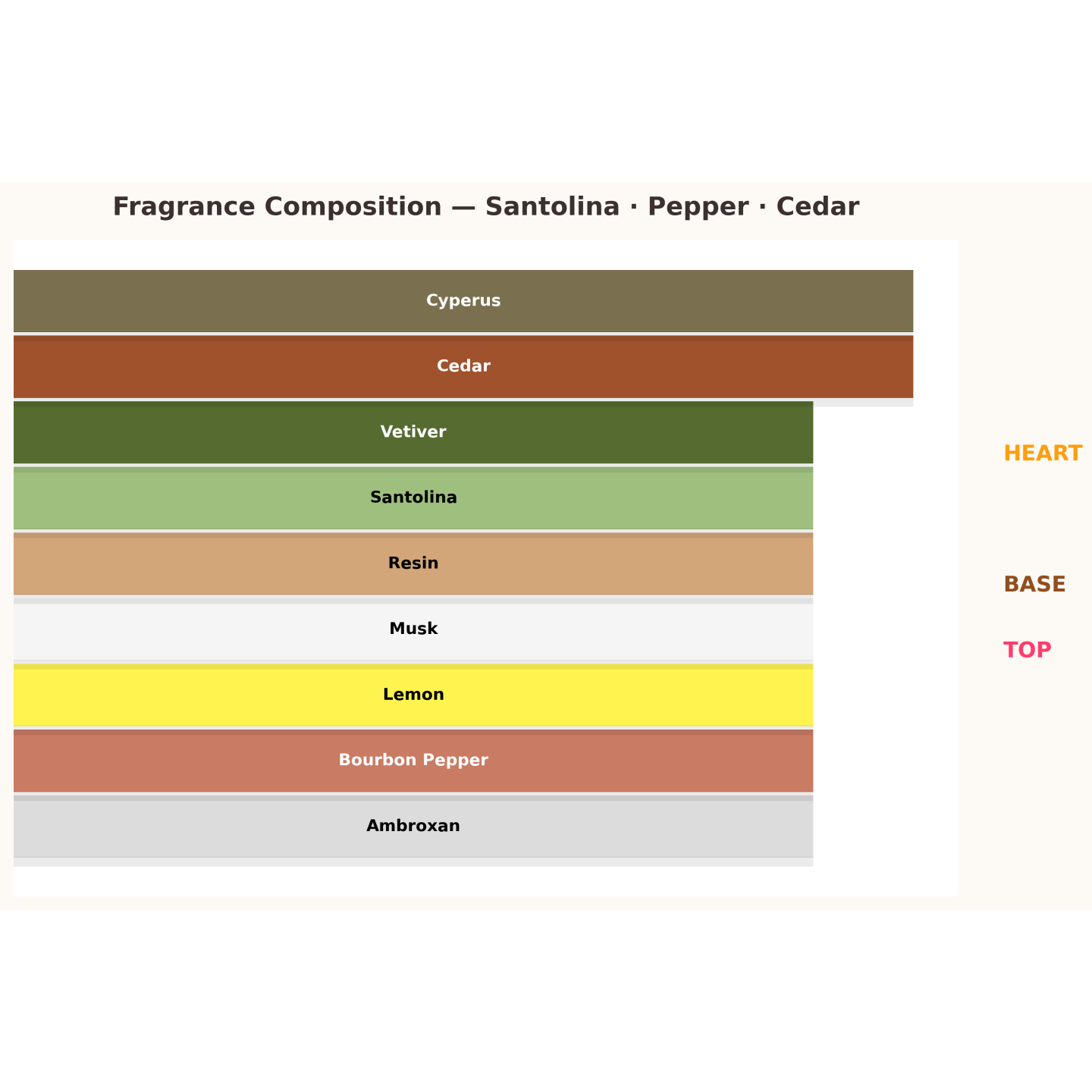 Es handelt sich um eine unverwechselbare, holzig-aromatische Komposition mit der spürbaren Frische von Zitrusfrüchten und der Wärme von Harzen.