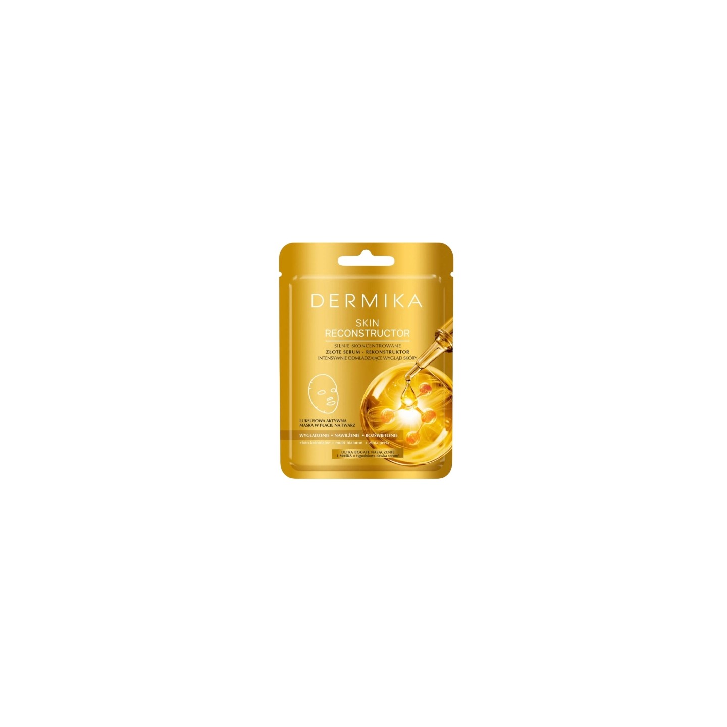 Eine luxuriöse Tuchmaske mit einem goldenen Serum, das die Haut intensiv mit Feuchtigkeit versorgt, glättet und zum Strahlen bringt und ihr jugendliches Aussehen zurückgibt.