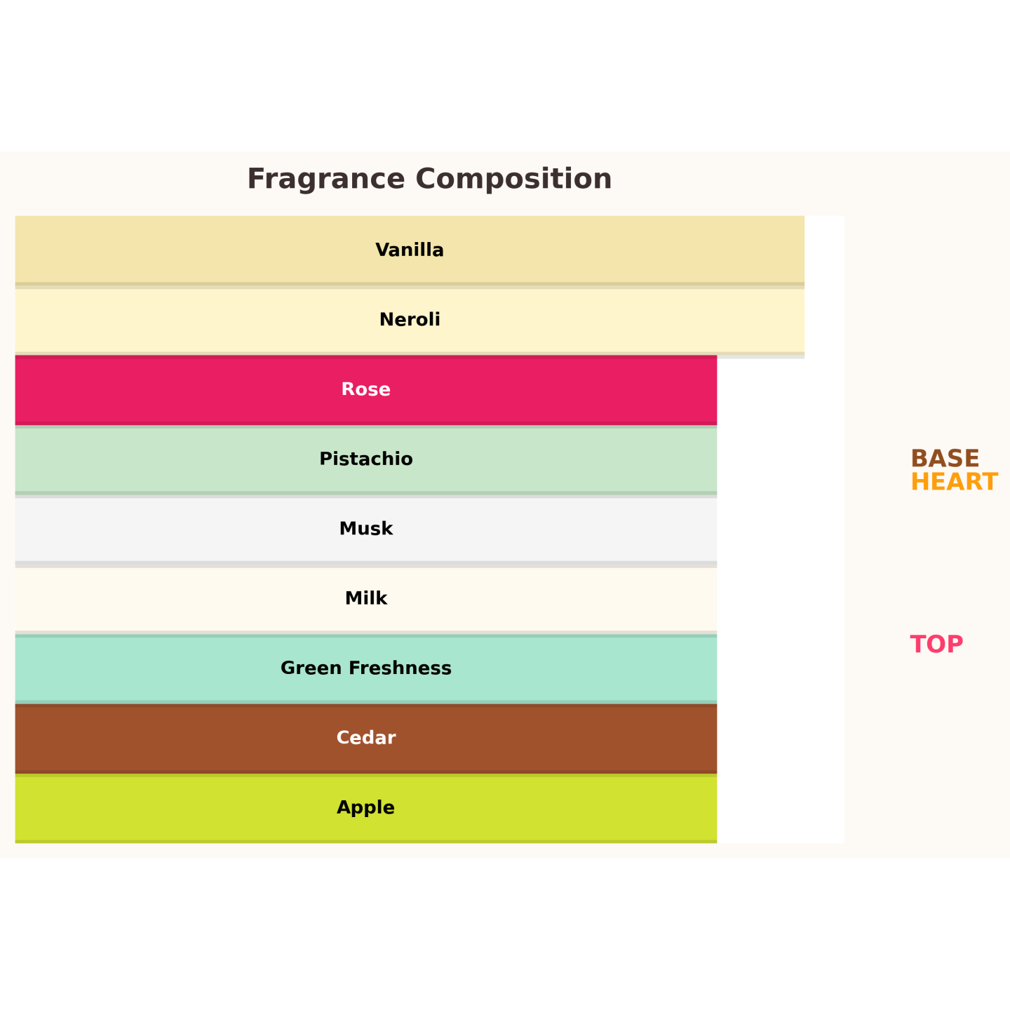 Der Duft vereint energetische Frische mit der wohligen, milchigen Vanille-Zartheit. Er eröffnet mit einem erfrischenden Akkord aus Pistazie, Apfel und grünem Blatt. Neroli und Rosenblüten bilden die Herznote, unterstützt von edler Zeder, und verleihen der Komposition eine elegante, florale Note. Die Basis ist eine cremige Mischung aus Vanille, Milch und Moschus, die eine sinnliche, langanhaltende Spur hinterlässt. Die perfekte Wahl für Frühling und Herbst, wenn Sie sich frisch, wohl und subtil verführerisch si möchten.