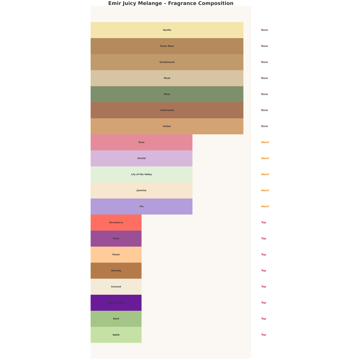 Emir Juicy Melange ist ein Duft, der Sie in ein sonniges Paradies entführt – einen Ort, an dem exotische Cocktails mit Eis prickeln, Früchte in der Sonne reifen und die Luft von fröhlicher, unbeschwerter Energie erfüllt ist. Diese Komposition ist voller Leben und Luxus und perfekt für alle, die sich einen Duft wünschen, der sowohl spontan als auch raffiniert ist. Die Kopfnote ist ein wahres Feuerwerk fruchtiger Süße: Erdbeere, schwarze Johannisbeere, Pflaume, Pfirsich, kokos , Apfel und würzige Muskatnuss, akzentuiert durch eine überraschende Note von frischem Basilikum, die der Komposition eine moderne, grüne Note verleiht. Die Herznote des Duftes entfaltet ein luxuriöses, pudriges Blumenbouquet: Orchidee, Jasmin, Rose, Maiglöckchen und Iris verwandeln die sinnliche Frische der Kopfnote in eine elegante, sinnliche Harmonie. Die Basisnote ist eine warme, cremige Sinnlichkeit: Vanille, Tonkabohne, Sandelholz, Zedernholz, einhüllender Moschus, Amber und Moos kreieren ein lang anhaltendes, samtiges Finish, das sich unglaublich angenehm auf der Haut anfühlt. Emir Juicy Melange ist intensiv, ausdrucksstark und harmonisch – perfekt für alle, die das Leben lieben und es mit einem Duft voller Energie, Eleganz und sinnlicher Lebensfreude bereichern möchten.
