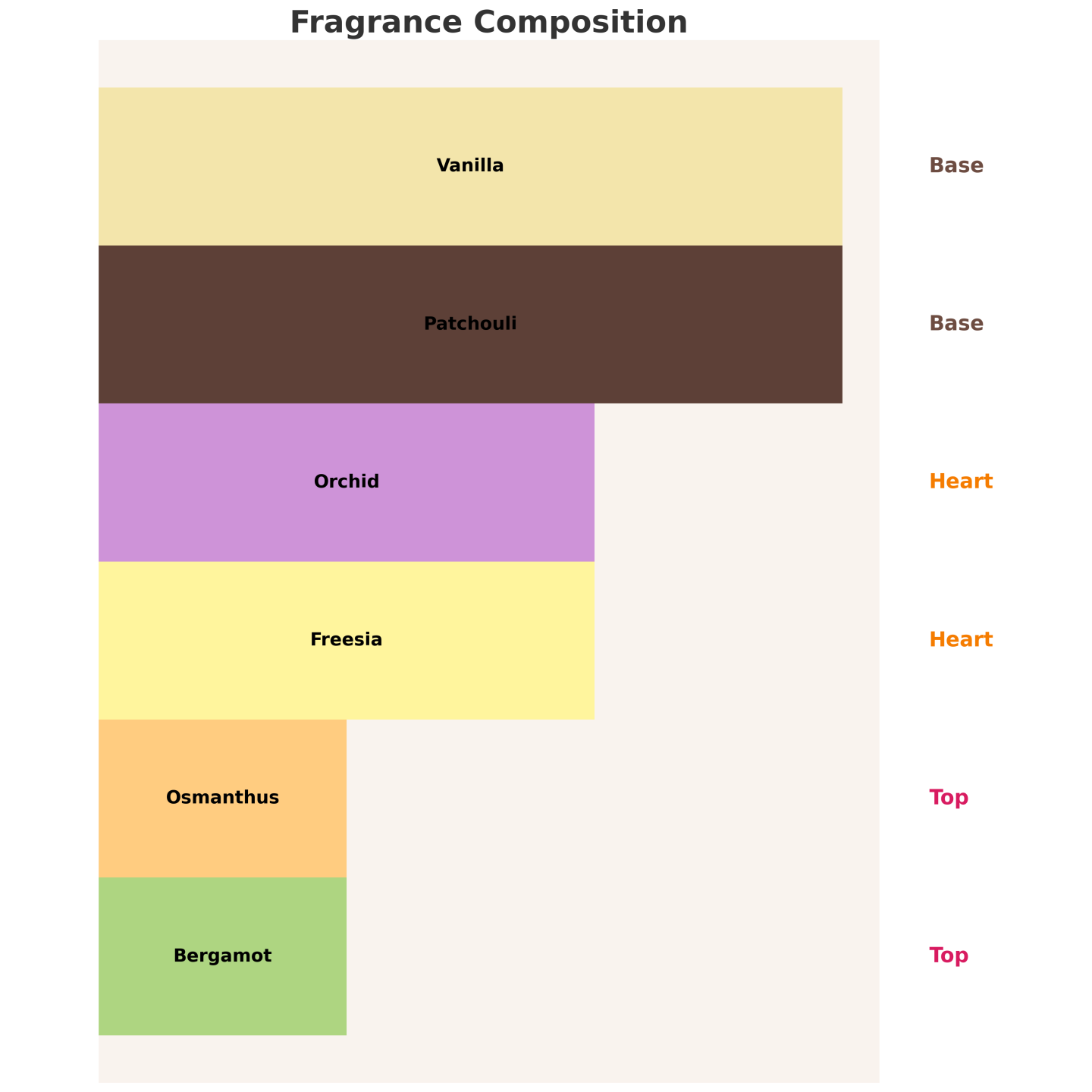 Es vereint frische Bergamotte und Osmanthus mit einem blumigen Herzen aus Orchidee und Freesie, umhüllt von Patschuli und Vanille.