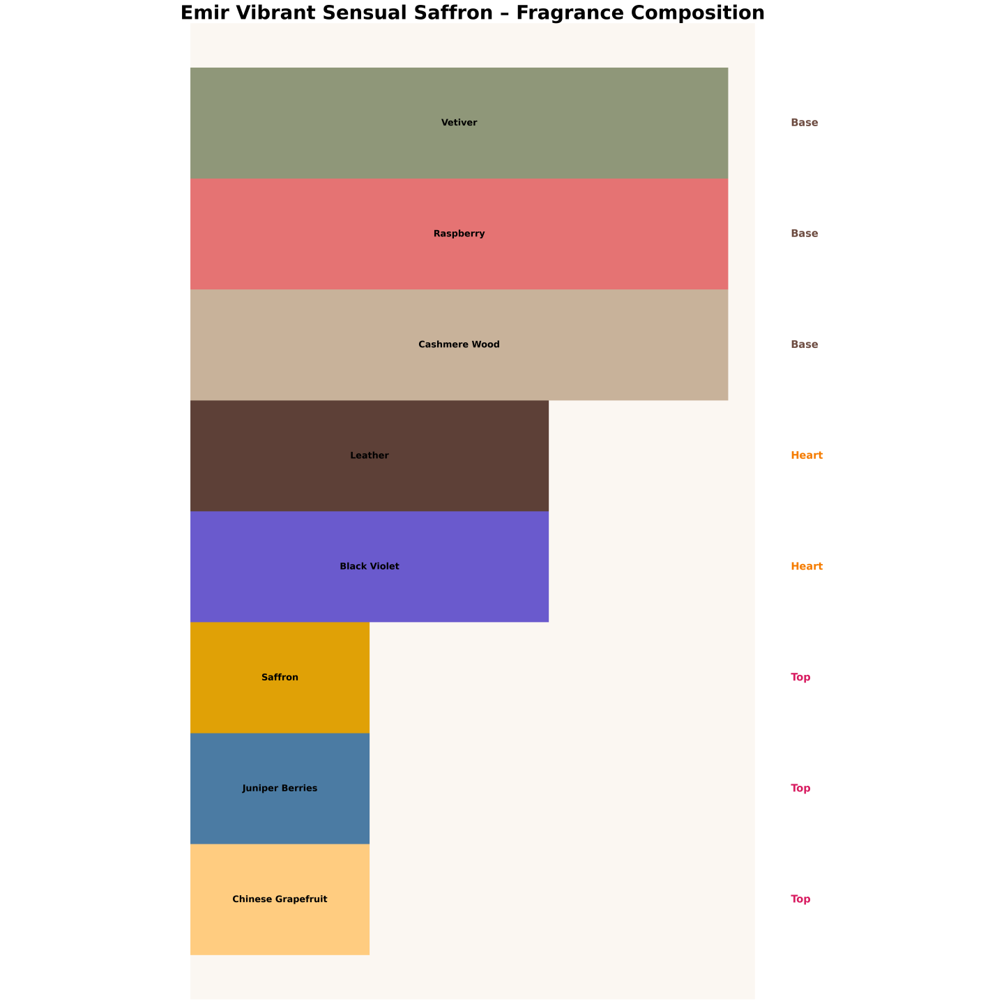 Exotique et sensuel : safran et genévrier en tête, cuir et violette noire en cœur, framboise et bois de cachemire en fond.