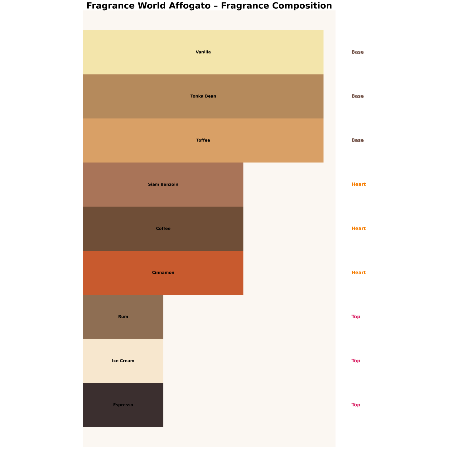 Comme un dessert italien de luxe : rhum, glace et expresso en entrée, puis café et cannelle, et enfin caramel, vanille et fève tonka en fond.