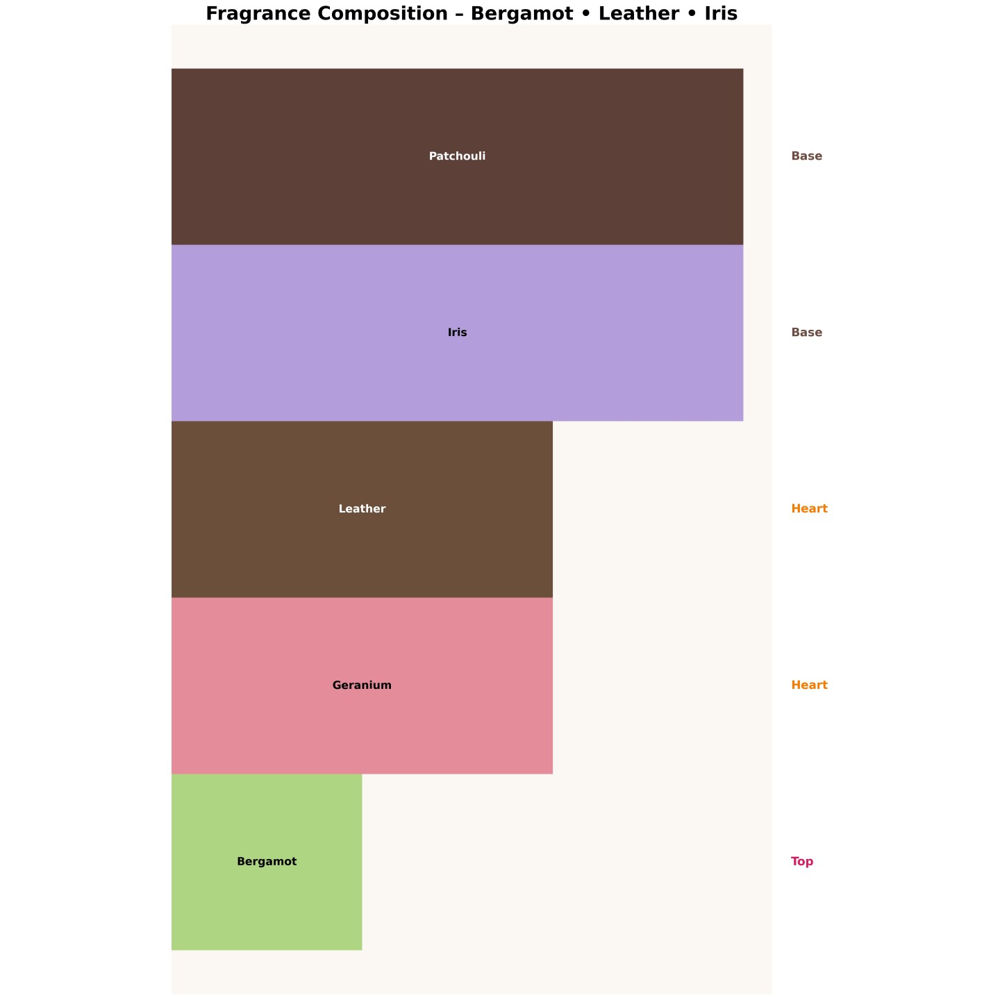 Des notes d'agrumes fraîches en tête, un cuir élégant en cœur et un boisé profond et poudré en fond.