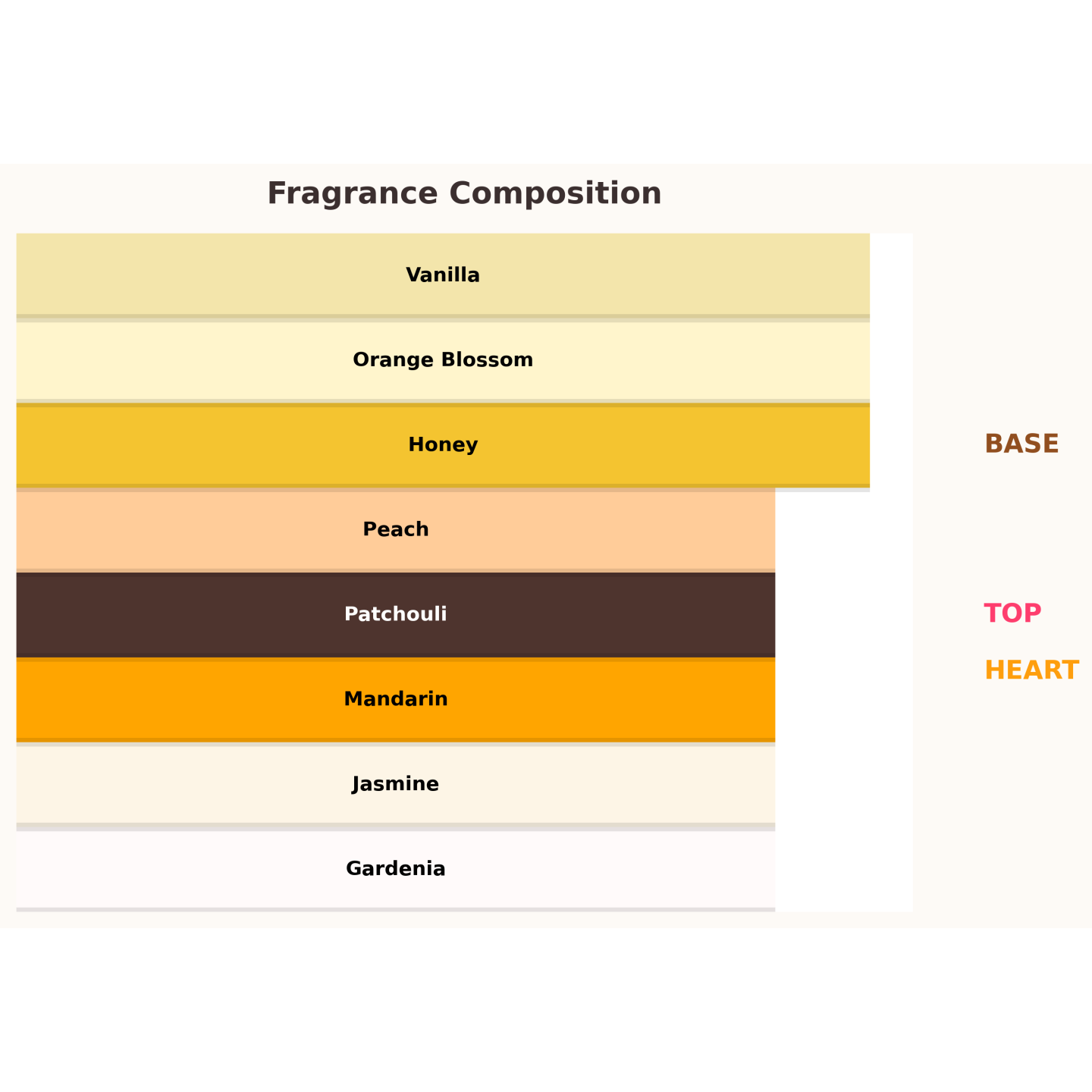 Honeymoon s'ouvre si des notes juteuses de mandarine et de pêche, conférant à la fragrance une légèreté fraîche et joyeuse. Le cœur s'épanouit avec la fleur d'oranger, le jasmin et le gardénia, un trio classique de fleurs blanches au caractère élégant et lumineux. Un fond de miel, de patchouli et de vanille apporte profondeur, chaleur et un final sensuel et enveloppant qui persiste longtemps sur la peau. Cette eau de parfum unisex s'adresse aux amateurs de compositions florales douces sur un fond oriental subtil : parfaite pour les occasions spéciales, les soirées romantiques et les moments où l'on recherche une fragrance élégante et mémorable.