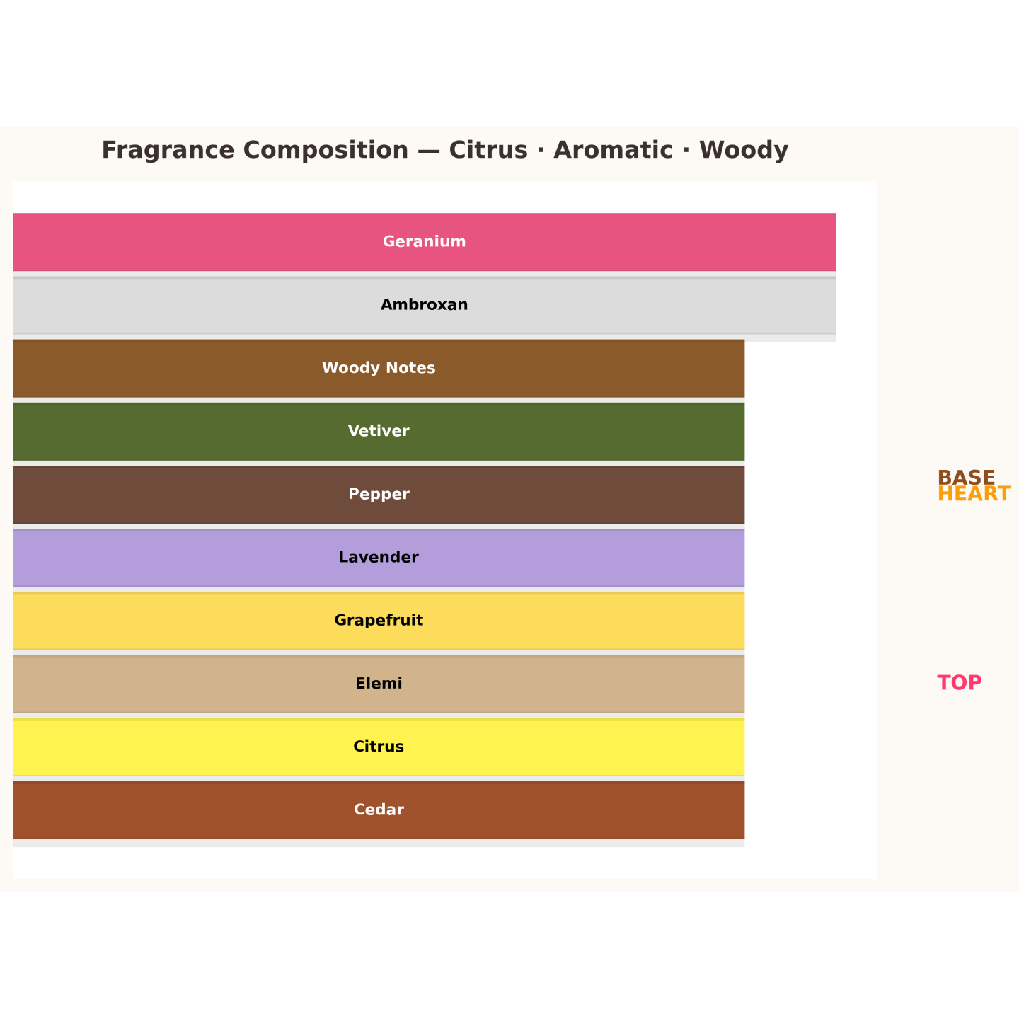 Une eau de parfum masculine au caractère hespéridé et aromatique, alliant la fraîcheur du pamplemousse et des agrumes à la lavande, au géranium et au poivre, sur un fond masculin d'ambroxan, de cèdre et de vétiver – parfaite au quotidien et pour les saisons chaudes.