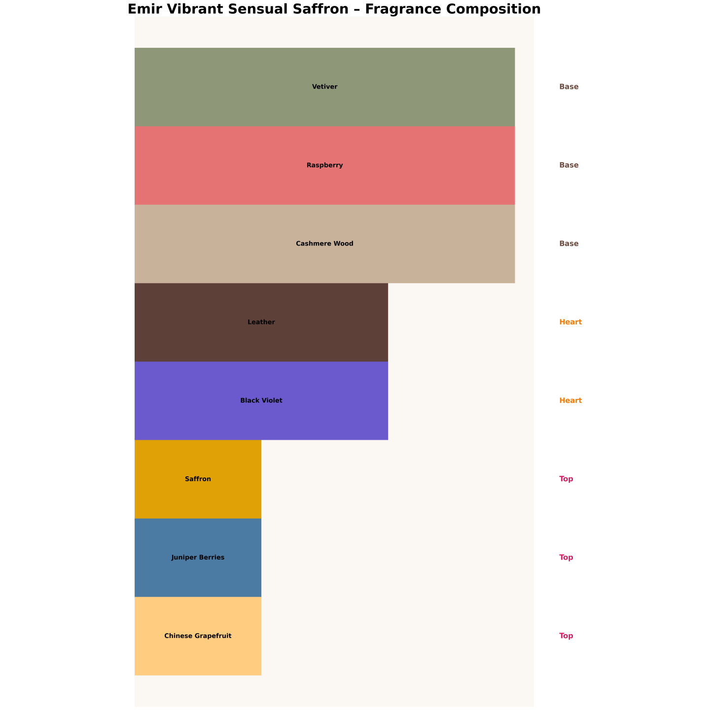 Exotic and sensual: saffron and juniper in the opening, leather and black violet in the heart, and raspberry and cashmere wood in the base.