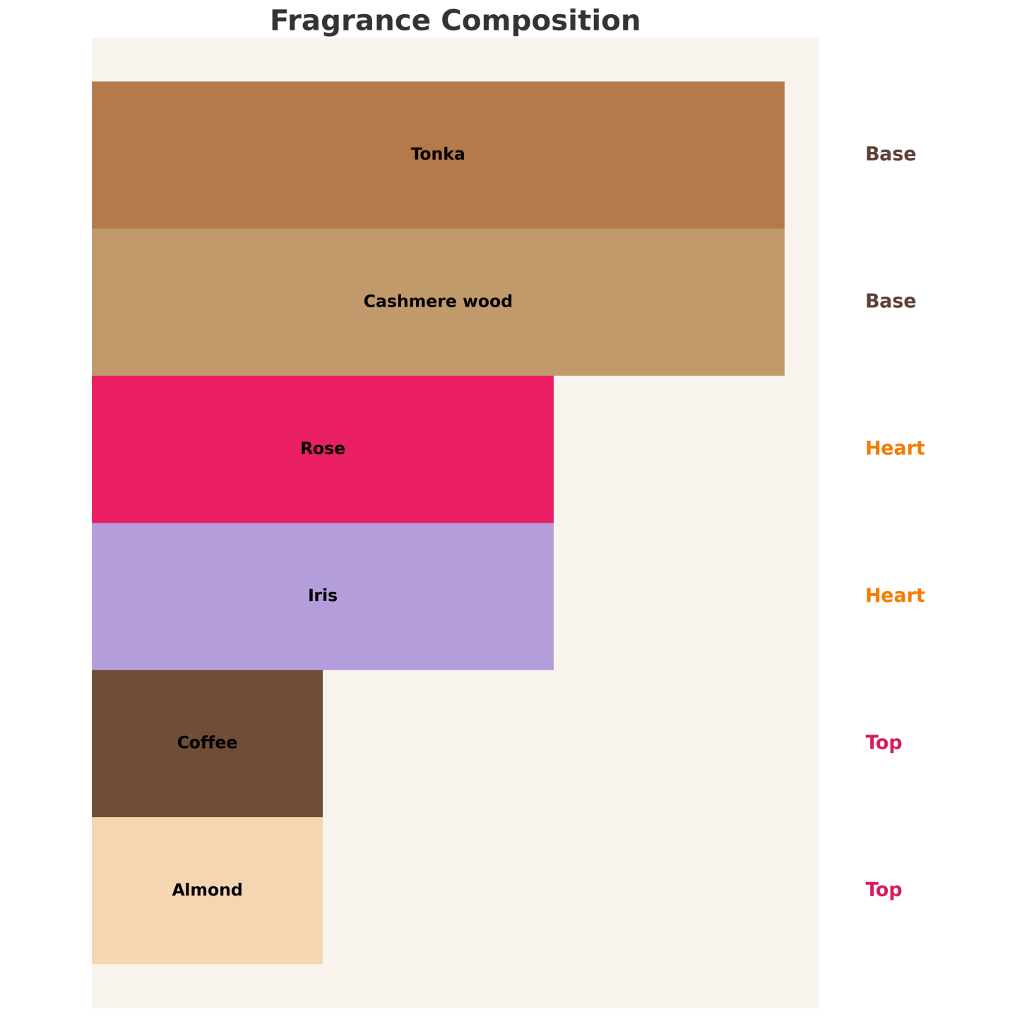 Elegant, sensual and feminine: almond and coffee to start, iris with rose in the heart, tonka bean and cashmere wood in the base.