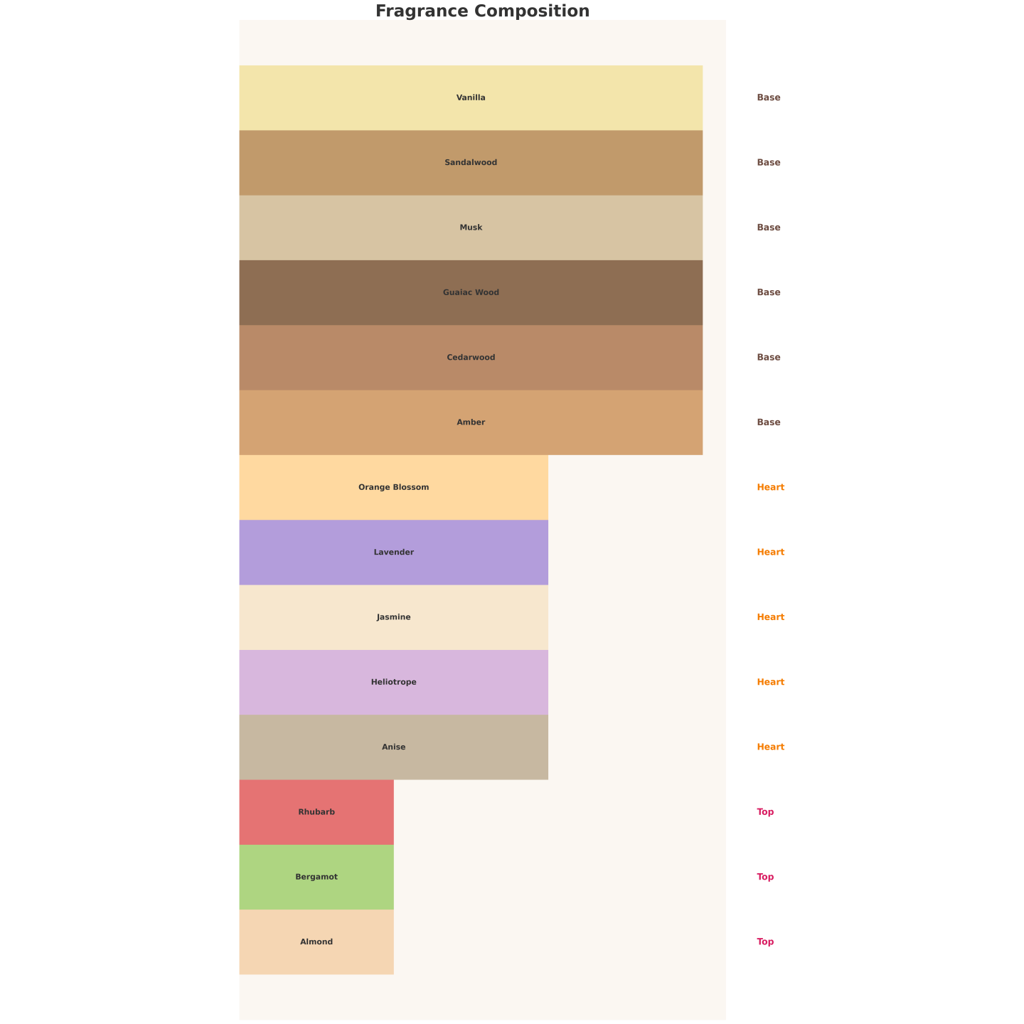Fris en zoet in de opening (bergamot, amandel, rabarber), bloemig en aromatisch in het hart (lavendel, jasmijn, heliotroop, anijs) en warm en romig in de basis (vanille, sandelhout, amber).