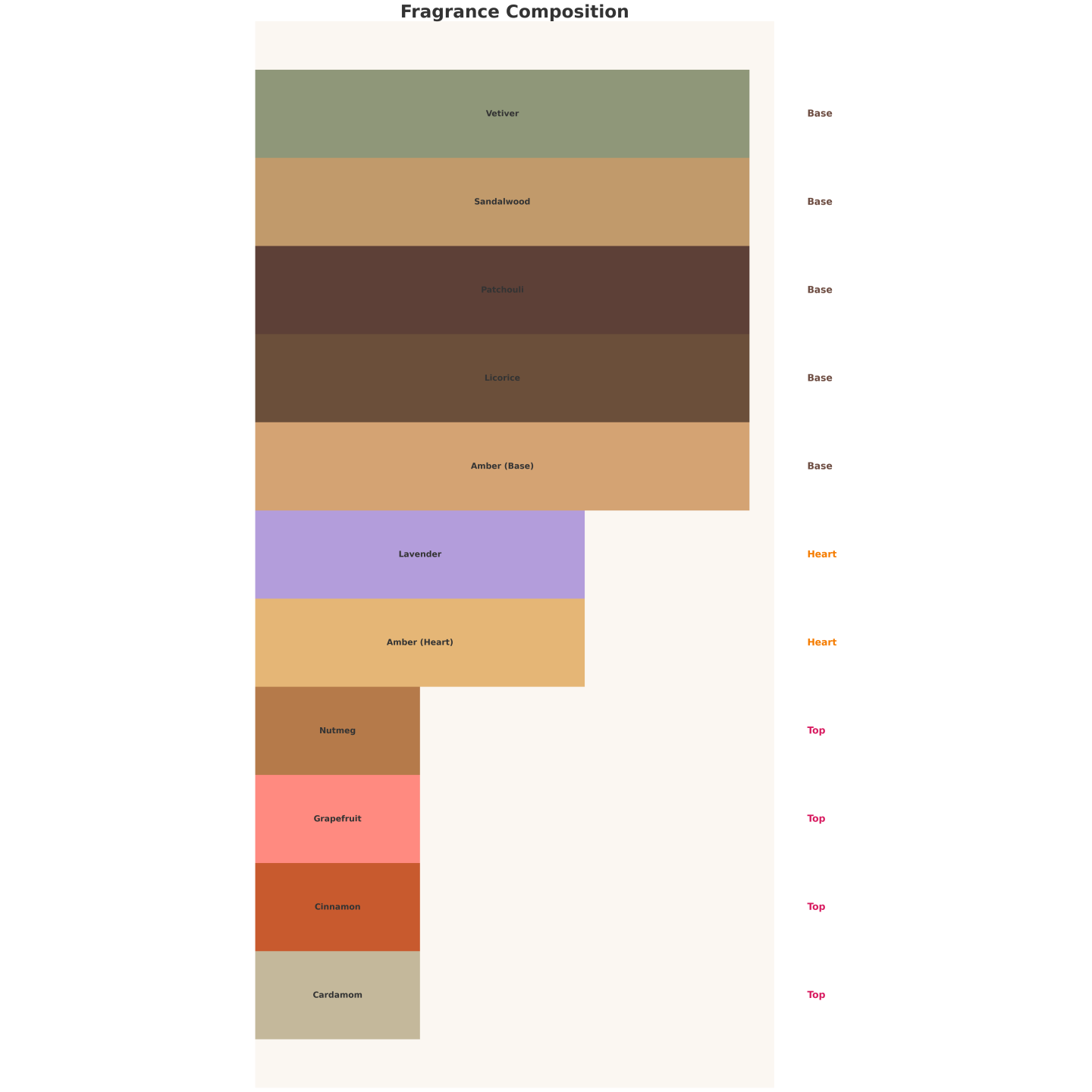 Warm, kruidig en elegant: een kruidige opening, kalmerende lavendel in het hart en een diepe, balsemachtige basis met patchouli, sandelhout en amber.