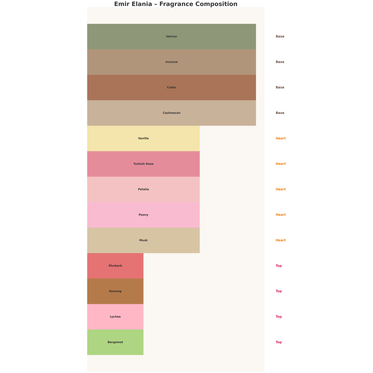 Emir Elania is een parfum dat je meevoert naar een koninklijke tuin, badend in zonlicht – een plek waar de lucht gevuld is met zoet fruit en majestueuze rozen. Deze geur is gecreëerd voor de moderne romanticus: een elegante, zelfverzekerde vrouw, ale delicaat en gracieus. De compositie si met de explosieve frisheid van lychee en de lichtzure, sappige rabarber, geaccentueerd door de lichte bergamot en de kruidigheid van nootmuskaat. Dit akkoord is vrolijk, fris en direct betoverend. In het hart bloeit een waarlijk koninklijk duo – Turkse roos en weelderige pioenroos, die samen met musk, vanille en een moderne noot van petalia een fluweelzacht, vrouwelijk en complementair hart van de compositie vormen. De basis omhult de huid met een elegante, warme waas van kasjmierhout, edel cederhout, aardse vetiver en subtiele wierook, wat de compositie een lange houdbaarheid, sensualiteit en verfijning verleent. Emir Elania is een geur die verrast, verwent en een prachtig, vrouwelijk spoor achterlaat. Dit is een parfum voor mensen die zich graag op hun best voelen.