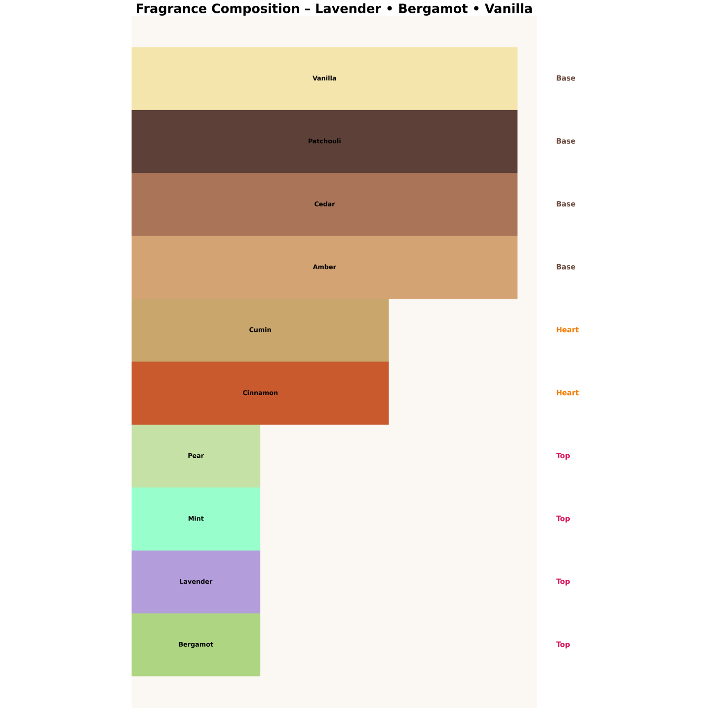 Zoet, fris en kruidig: peer en munt in de topnoten, kaneel en komijn in het hart, en romige vanille en houtachtige akkoorden in de basis.
