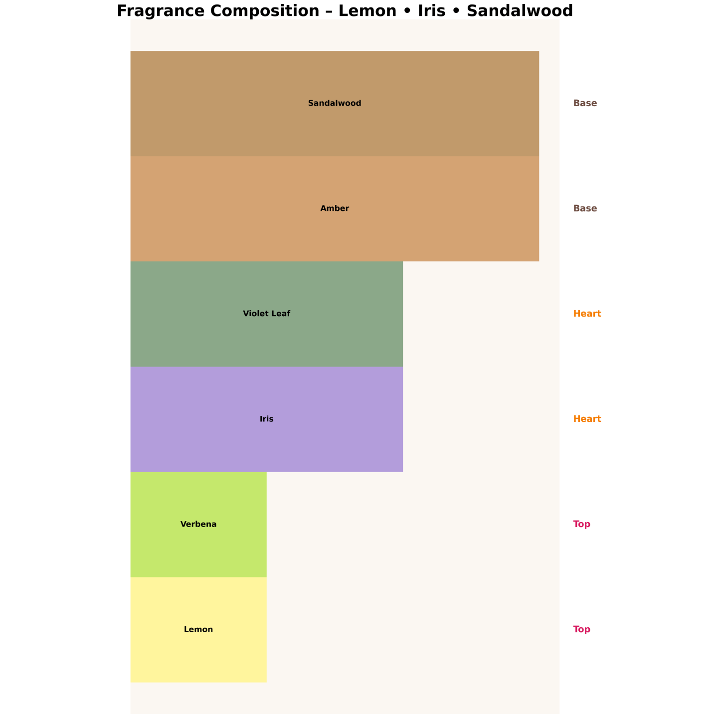 Fris en citrusachtig in de opening, elegant en poederachtig in het hart, warm en houtachtig in de basis.