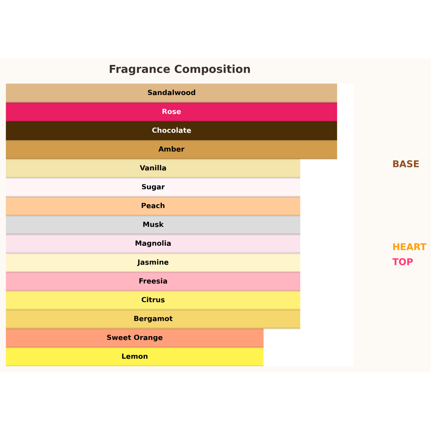 Een stralende en energieke geur die de klassieke elegantie van rozen combineert met een moderne, gastronomische sensualiteit. si opent met een vrolijke mix van bergamot, citrus en perzik, onderbroken door een vleugje chocolade. Het hart is een stralend boeket van roos, fresia, magnolia en jasmijn. De basis omhult de huid met de warmte van vanille, suiker, amber, muskus en sandelhout, wat urenlang een fluweelzachte aura achterlaat. Perfect voor dagelijks gebruik en speciale gelegenheden, het hele jaar door.