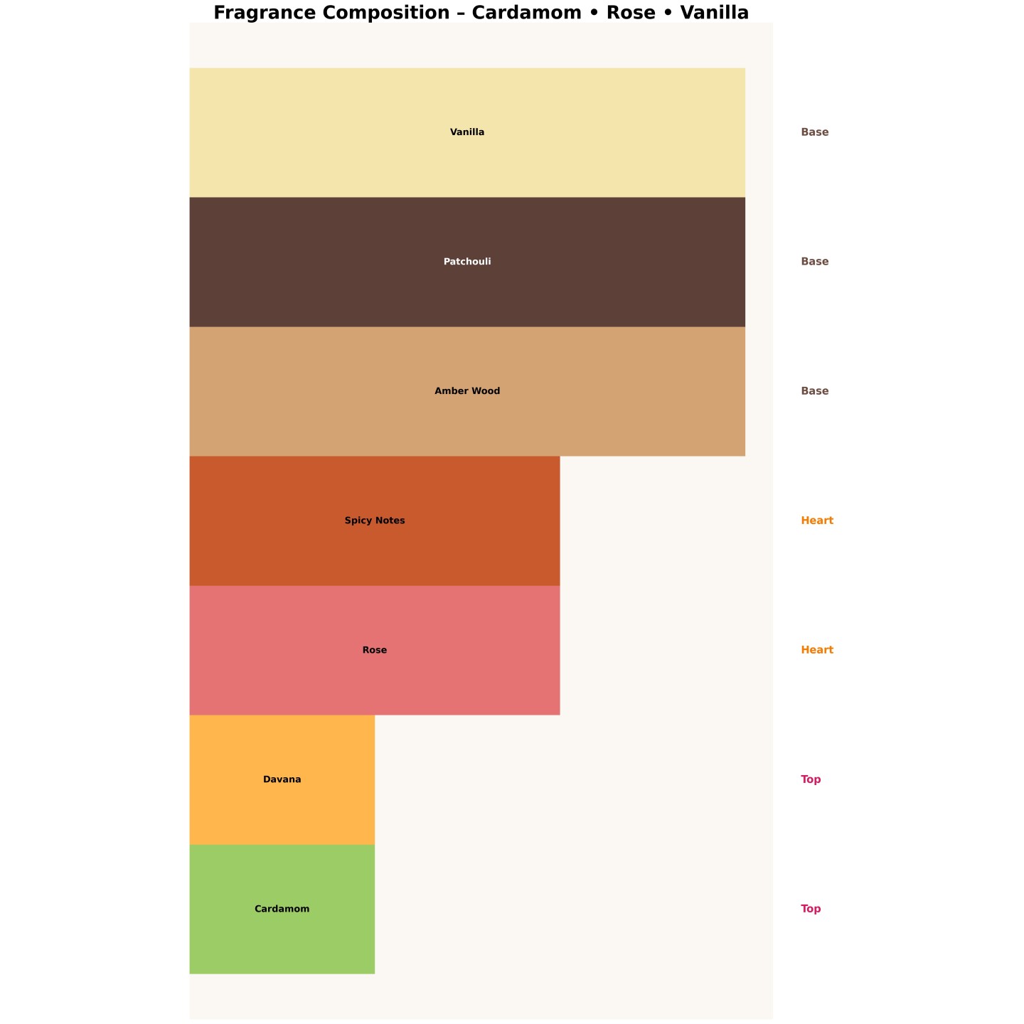 Теплий, пряний та східний – з кардамоном та трояндою та солодко-деревною основою.