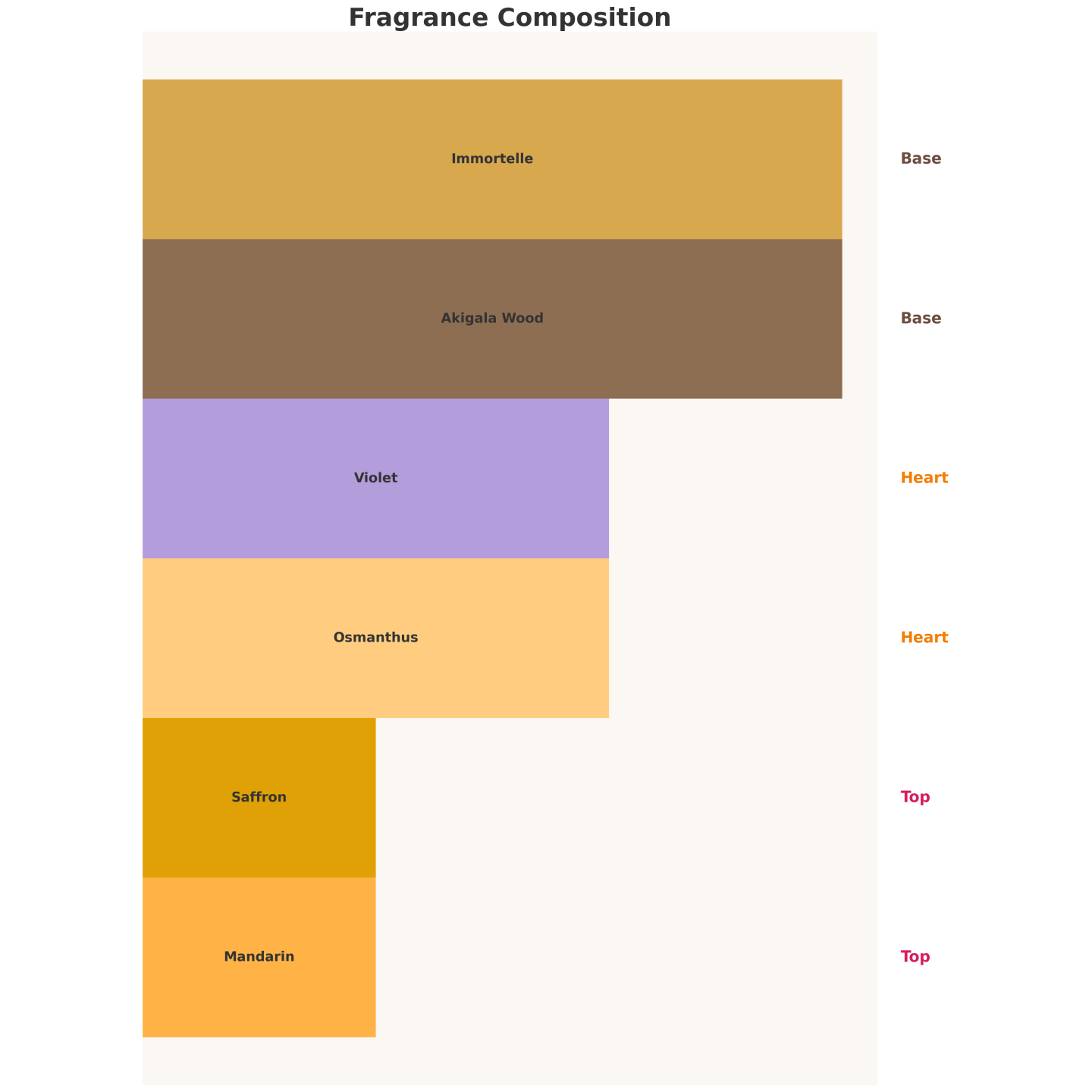 Це елегантне поєднання мандарина та шафрану, пудрової фіалки, ніжного абрикосового османтусу та теплої, глибокої бази з акігалі та безсмертника.