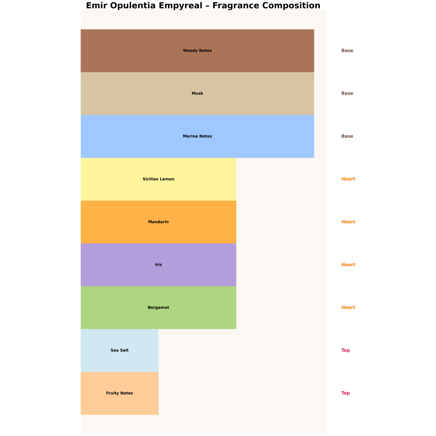 Opulentia Empyreal – це аромат, створений для тих, хто прагне елегантності в сучасній, легкій формі. Ця композиція сповнена класу, ясності та гармонії – ідеально підходить для моментів, коли ви хочете пахнути свіжо, стильно та сяюче. Вона надихає si в атмосферу розкоші, де цитрусові, квіткові та деревні ноти переплітаються в чисте, збалансоване ціле. Він відкривається бадьорою сумішшю фруктів у поєднанні з мінеральною, свіжою морською сіллю, яка миттєво створює відчуття чистоти та сяйва. У серці композиції – елегантні акорди сицилійського лимона, яскравого бергамоту, пудрового ірису та соковитого мандарина – поєднання свіжості, ніжності та витонченої розкоші. База огортає шкіру м’яким серпанком морських нот, чистого мускусу та деревних нот, надаючи композиції стійкості та вишуканого післясмаку. Цей аромат ідеально підходить для людей, які люблять легкі, елегантні, чисті та позачасові композиції, залишаючи свіже, надзвичайно приємне враження.
