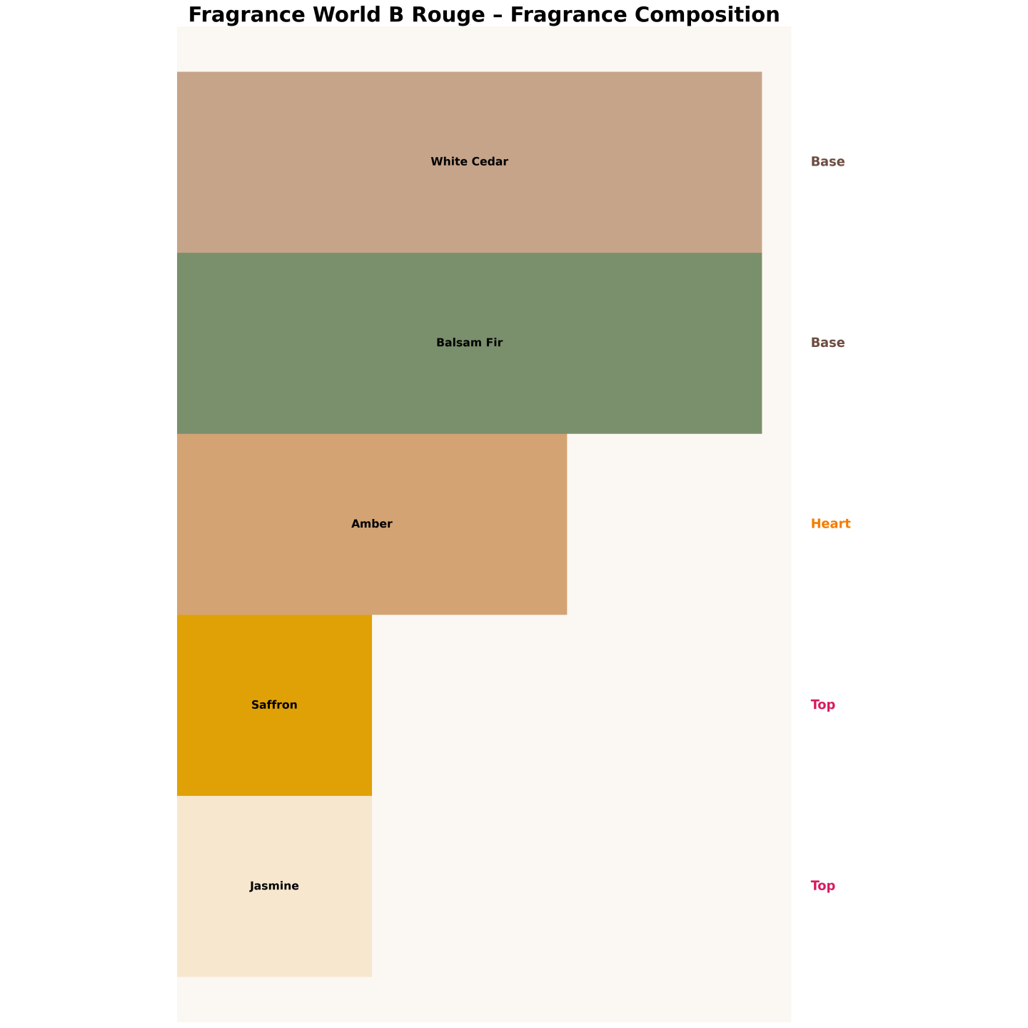 B-Rouge – це аромат, створений для тих, хто прагне незабутніх вражень. Це не просто парфуми, це емоції, розкіш та таємничість, загорнуті в елегантну композицію. Кожен шар створює гіпнотичний образ, який супроводжує вас протягом усього дня, немов чуттєвий підпис. Початкові ноти полонить королівським дуетом: шафран привносить насиченість, пряну інтенсивність та східну глибину, а жасмин додає шовковистої елегантності та сяючого квіткового сяйва. У серці аромату si сучасна harmonia : амбервуд та амбра переплітаються в м’якій, теплій, мінеральній аурі, що огортає, немов розкішна вуаль. База – це глибока деревно-смолиста структура: кедр, ялицева смола та теплі смоляні ноти створюють тривалий, чуттєвий фініш, який тримається на шкірі годинами, підкреслюючи вашу присутність у витонченому, елегантному стилі. B-Rouge – це аромат для тих, хто хоче випромінювати силу, розкіш та таємничість без слів.