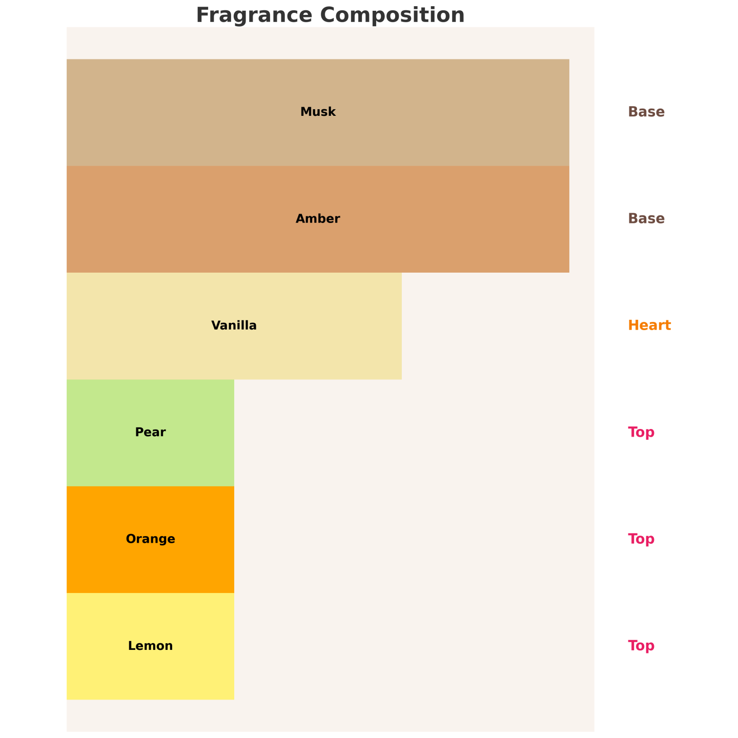Свіжий, радісний та енергійний: цитрусові та фрукти у вступі, ваніль у серці, мускус та амбра в базі.