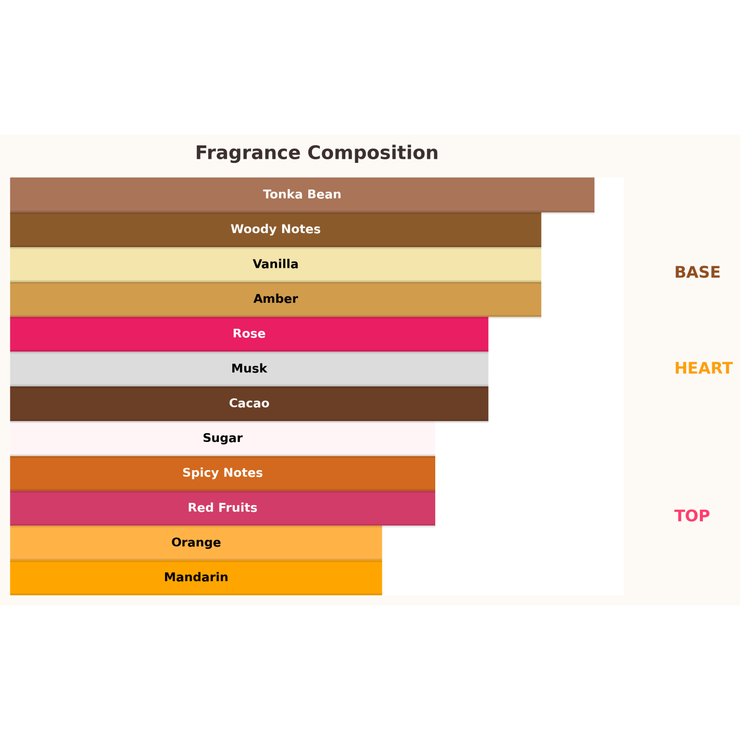 Чуттєвий, але водночас витончений гурманський аромат, що поєднує радісну, фруктову свіжість з теплотою та елегантністю. Верхні ноти: цукор, червоні фрукти, мандарин та апельсин – злегка солодкий, бадьорий досвід. У серці ваніль, какао, спеції та троянда створюють кремову м'якість та інтимну глибину. База з бобів тонка, амбри, мускусу та деревних нот залишає довгий, оксамитовий шлейф.