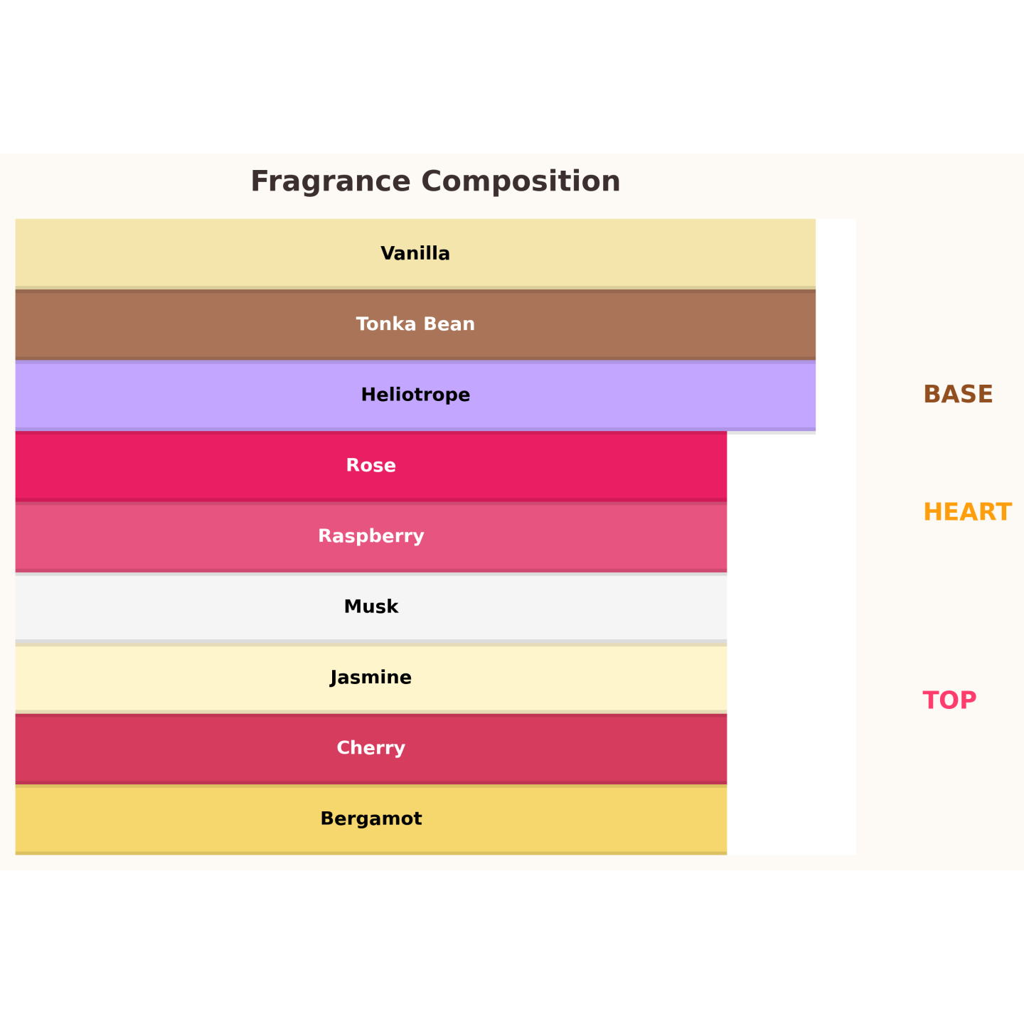 Już od pierwszych chwil Sweet Cherry Kiss otula skórę radosnym, letnim duetem wiśni i malin doprawionym świeżością bergamotki. W sercu rozkwita pudrowy akord heliotropu, róży i jaśminu, który dodaje kompozycji kobiecego wdzięku. Baza z fasolką tonką, wanilią i piżmem tworzy miękki, zmysłowy ogon zapachu. Idealny wybór na wiosnę i lato – lekki, świeży, przyciągający uwagę swoją owocowo-kwiatową harmonią.