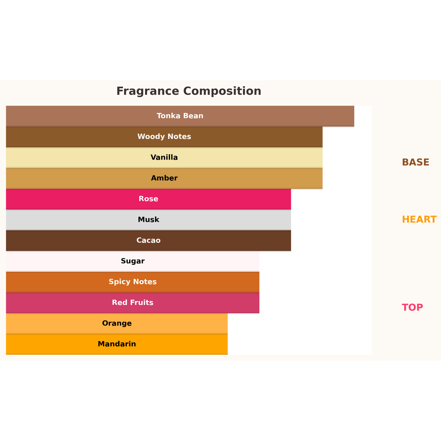 Zmysłowy, lecz subtelny gourmand, który łączy radosną, owocową świeżość z ciepłem i elegancją. Otwarcie to cukier, czerwone owoce, mandarynka i pomarańcza – lekko słodkie, energetyzujące wrażenie. W sercu wanilia, kakao, przyprawy i róża tworzą kremową miękkość i intymną głębię. Baza z fasolą tonka, bursztynem, piżmem i nutami drzew zostawia długi, aksamitny ślad.
