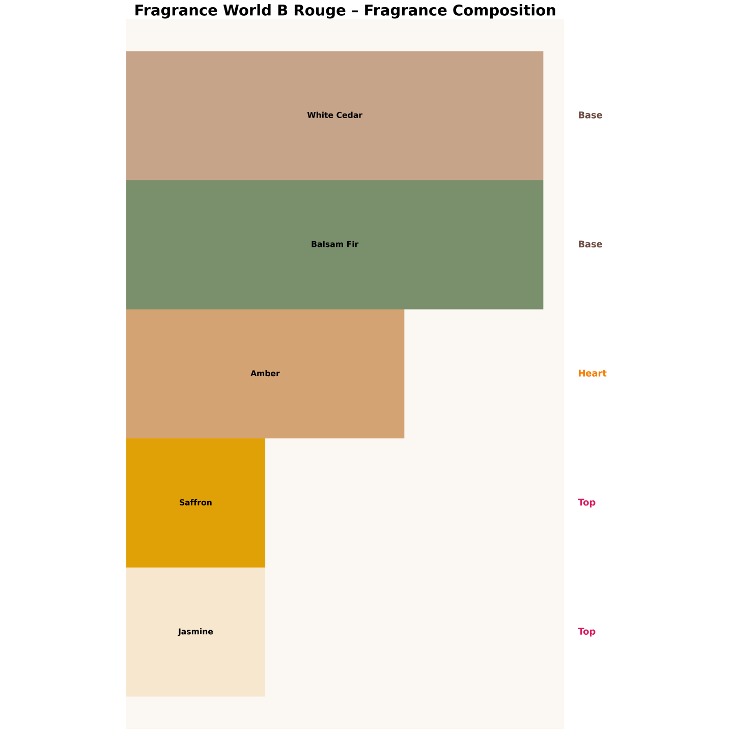 B-Rouge to zapach stworzony dla osób pragnących doświadczenia, które zapada w pamięć. To nie tylko perfumy — to emocje, luksus i tajemniczość zamknięte w eleganckiej kompozycji. Każda warstwa tworzy hipnotyczny obraz, który towarzyszy Ci przez cały dzień, niczym zmysłowy podpis. Otwarcie zachwyca królewskim duetem: szafran wnosi bogactwo, pikantną intensywność i orientalną głębię, natomiast jaśmin dodaje jedwabistej elegancji oraz świetlistego, kwiatowego blasku. W sercu zapachu pojawia się nowoczesna harmonia: drzewo bursztynowe i ambra splatają się w miękką, ciepłą, mineralną aurę, która otula jak luksusowy welon. Baza to głęboka, drzewno-żywiczna struktura: cedr, żywica jodłowa oraz ciepłe nuty żywiczne tworzą długotrwały, zmysłowy akord finiszowy, który pozostaje na skórze godzinami i podkreśla Twoją obecność w subtelnym, eleganckim stylu. B-Rouge to zapach dla tych, którzy chcą emanować siłą, luksusem i tajemniczością bez słów.